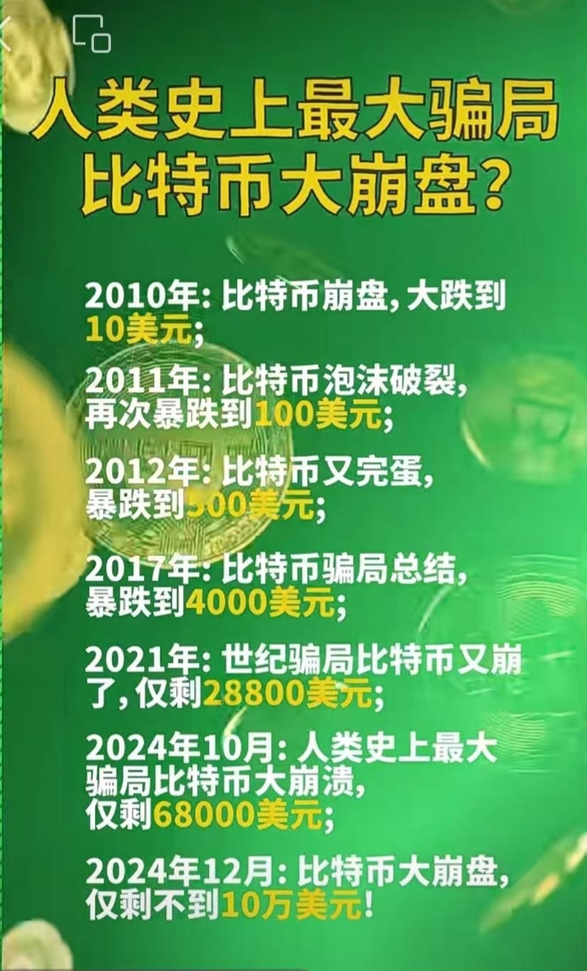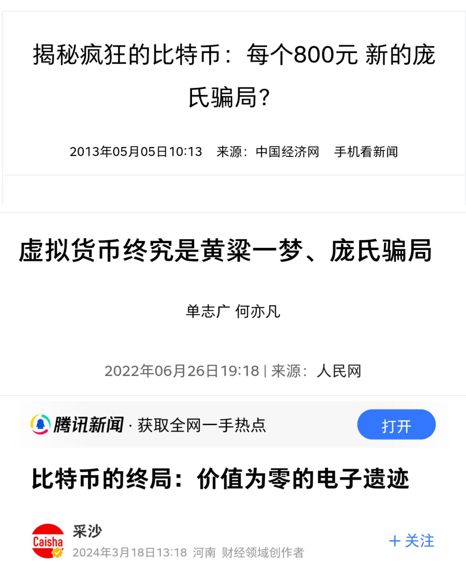 2013年5月5日——“揭秘疯狂的比特币:每个800元,新的庞氏骗局?”2022年6月26日——“虚拟货币终究是黄粱一梦、庞氏骗局?”2024年3月18日——“比特币的终局:价值为零的电子遗迹”不得不说这十多年来除了比特币的价格不断创新高外,媒体记者们的起标题水平也在不断跃进
